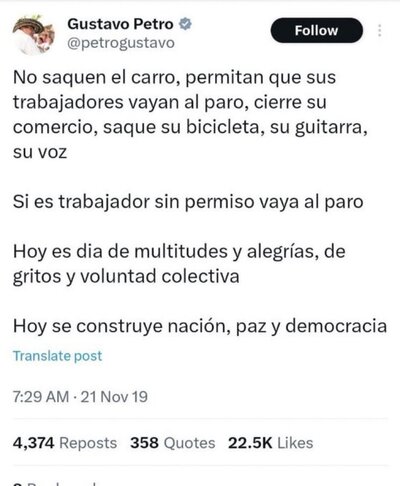 "No saquen el carro, permitan que sus trabajadores vayan al paro, cierre su comercio, saque su bicicleta, su guitarra, su voz. Si es trabajador sin permiso vaya al paro. Hoy es día de multitudes y alegrías, de gritos y voluntad colectiva. Hoy se construye nación, paz y democracia", escribió en ese momento el actual mandatario.