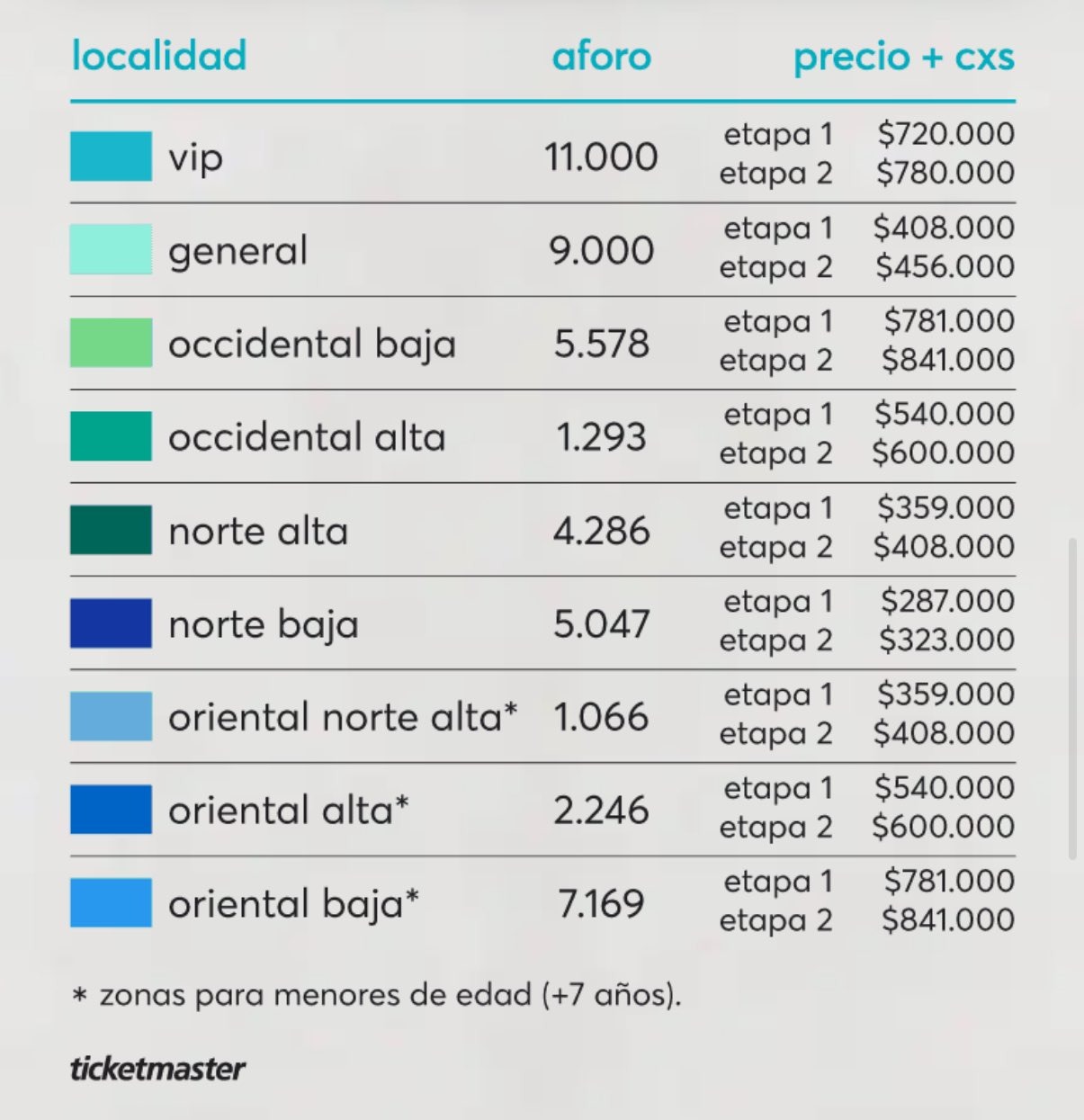 Ticketmaster.co, las entradas estarán disponibles en tres etapas: la preventa para fans arranca el 7 de abril desde las 10:00 a.m.; la preventa para tarjetas Visa de bancos seleccionados iniciará el martes 8 de abril a la misma hora; y la venta general comenzará el jueves 10 de abril, también a las 10:00 a.m.