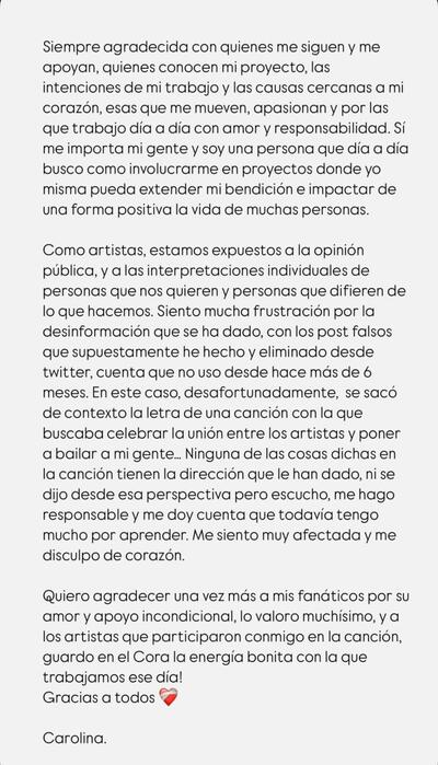 Por ello, señaló que se hace responsable y que tiene “mucho por aprender. Me siento muy afectada y me disculpo de corazón (…) A los artistas que participaron conmigo en la canción, guardo en el cora la energía tan bonita con la que trabajamos ese día”.