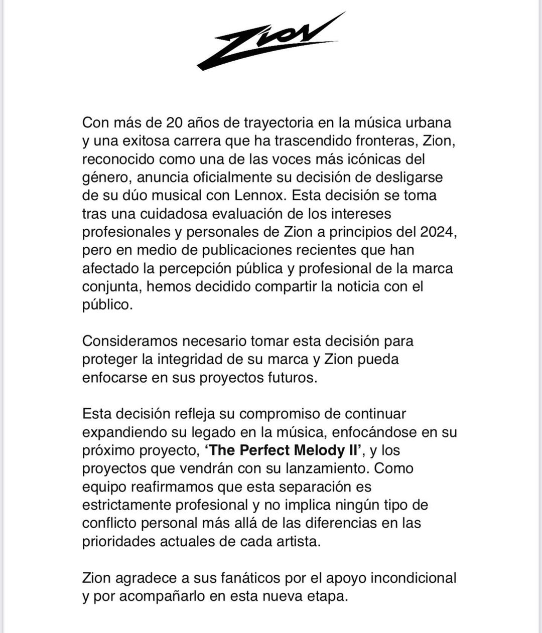 En ese sentido, la misiva señala que la separación busca que Zion pueda seguir “expandiendo” su legado en el género y que también pueda enfocarse en su próximo proyecto llamado ‘The Perfect Melody II’ y todo lo que implicará el lanzamiento.