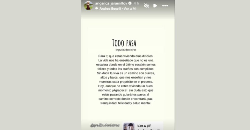 Asimismo, recientemente Angélica se volvió a pronunciar a través de sus redes sociales. En una historia desde su perfil de Instagram, Jaramillo compartió un escrito sobre superación que, teniendo en cuenta lo que ha ocurrido en los últimos días, pareciera ser un mensaje para ella misma.