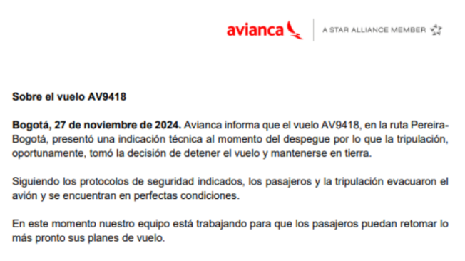 Sobre el incidente, la aerolínea manifestó: "Avianca informa que el vuelo AV9418, en la ruta Pereira-Bogotá, presentó una indicación técnica al momento del despegue por lo que la tripulación, oportunamente, tomó la decisión de detener el vuelo y mantenerse en tierra".