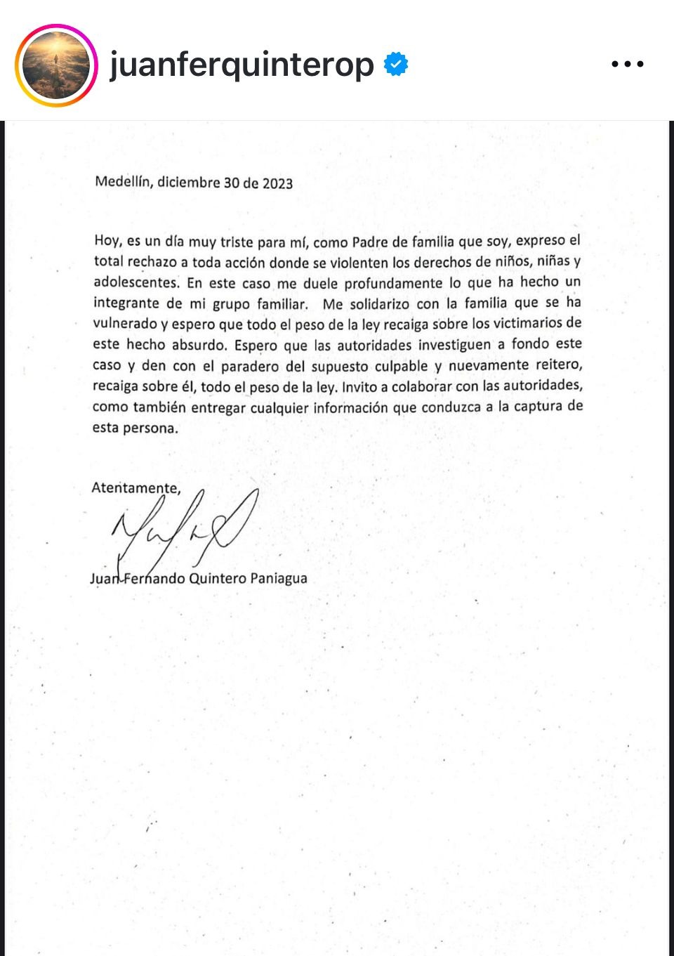 “Hoy, es un día muy triste para mí, como padre de familia que soy, expresó el total rechazo a toda acción donde se violenten los derechos de niños, niñas y adolescentes”, se puede leer en la misiva.