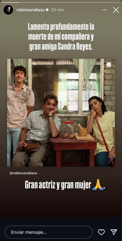 El actor Robinson Díaz, con quien compartió en la serie 'Rigo', también reaccionó a este lamentable fallecimiento. A través de sus historias de Instagram compartió una publicación del Canal RCN en homenaje a la actriz y escribió: "Lamento profundamente la muerte de mi compañera y gran amiga Sandra Reyes. Gran actriz y gran mujer", escribió.