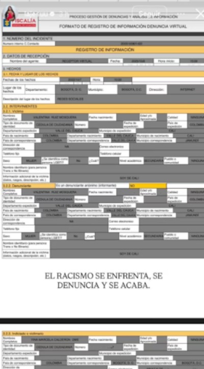 Junto al mensaje, la creadora de contenido publicó una copia del documento emitido por la Fiscalía General de la Nación, correspondiente al Proceso de Gestión de Denuncias y Análisis de Información, en el que se registra la denuncia virtual interpuesta contra Yina Calderón.